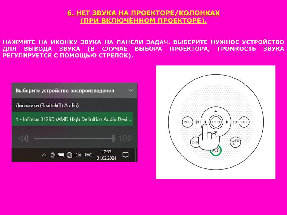НЕТ ЗВУКА НА ПРОЕКТОРЕ/КОЛОНКАХ (ПРИ ВКЛЮЧЁННОМ ПРОЕКТОРЕ)